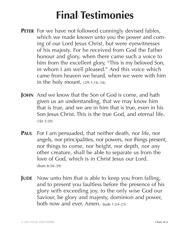 The writers of the New Testament were not timid. They were eager to bear testimony of the things that they had seen and heard and to give "a reason of the hope" that was in them (1Pt 3:15).While these writers may have commenced their gospel narratives and personal spiritual lives at different points of departure (see, for example, chart 7-2), these chosen witnesses all conclude their work at the same point of arrival. As chart 18-11 shows, Peter's bottom line is that Jesus was the Son of God. John's ultimate reality is that the Son of God has come. Paul's final assurance is that nothing can separate us from the love of God which is in Jesus Christ. Jude's lasting testimony is that Jesus is the only true and wise God.